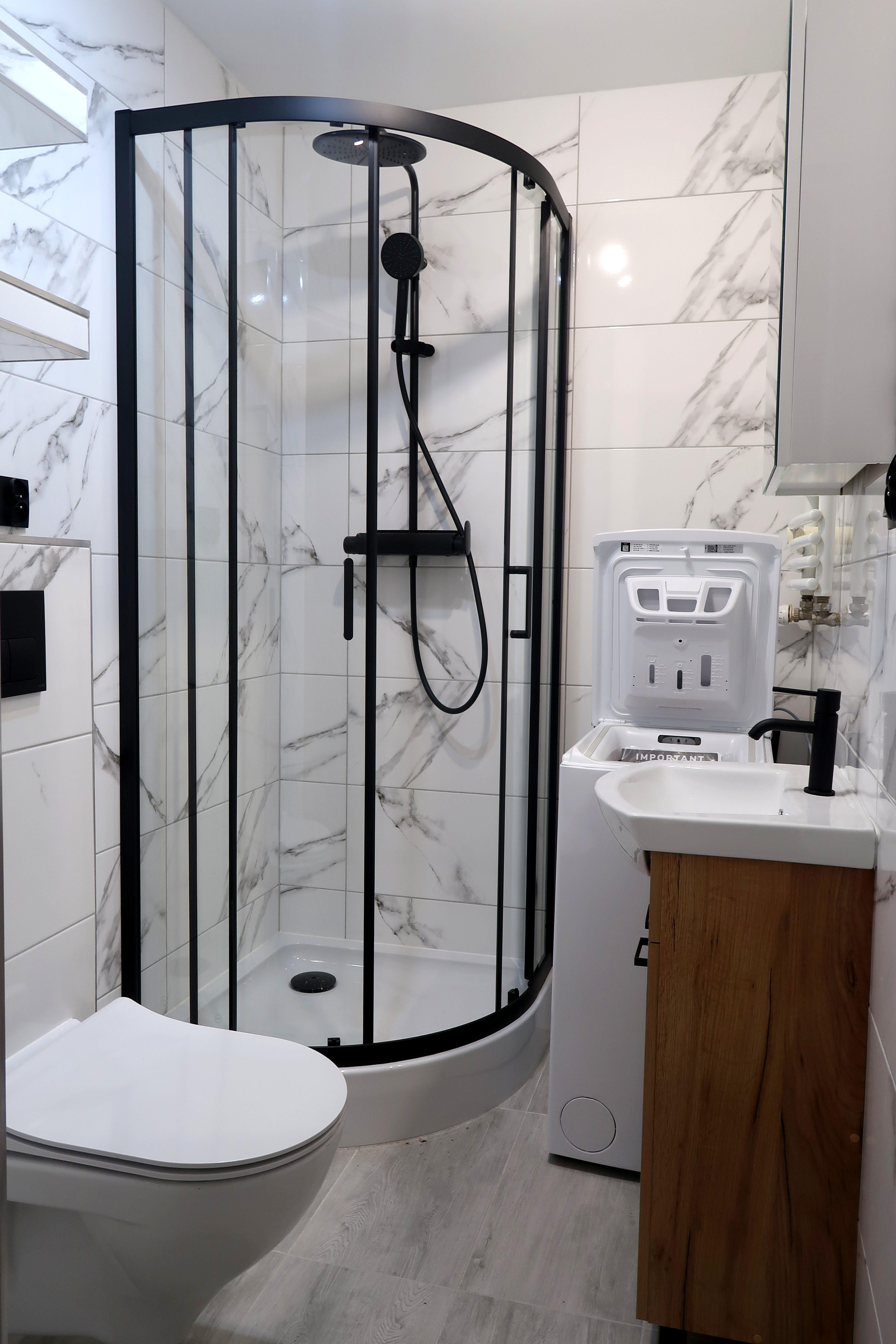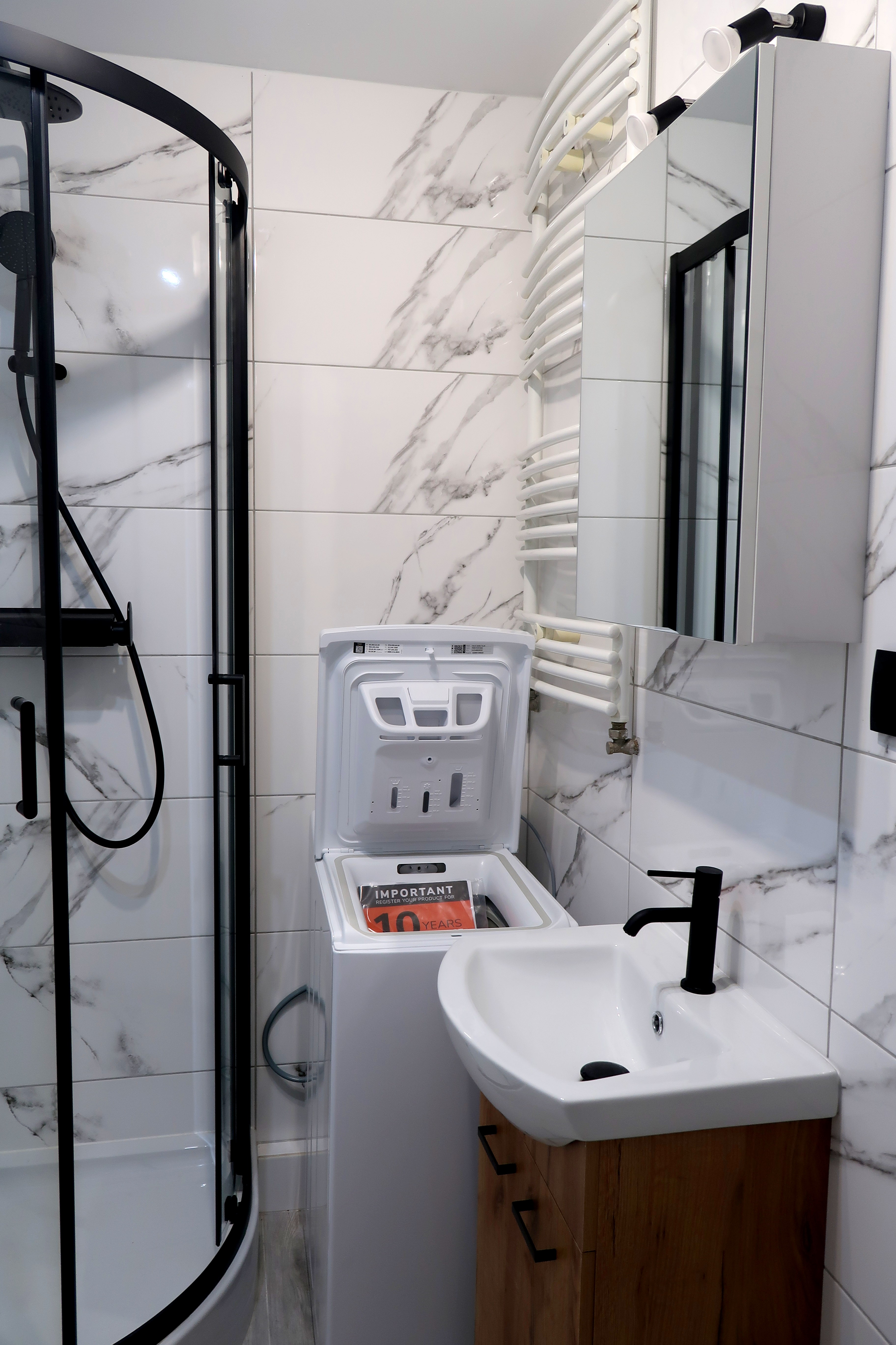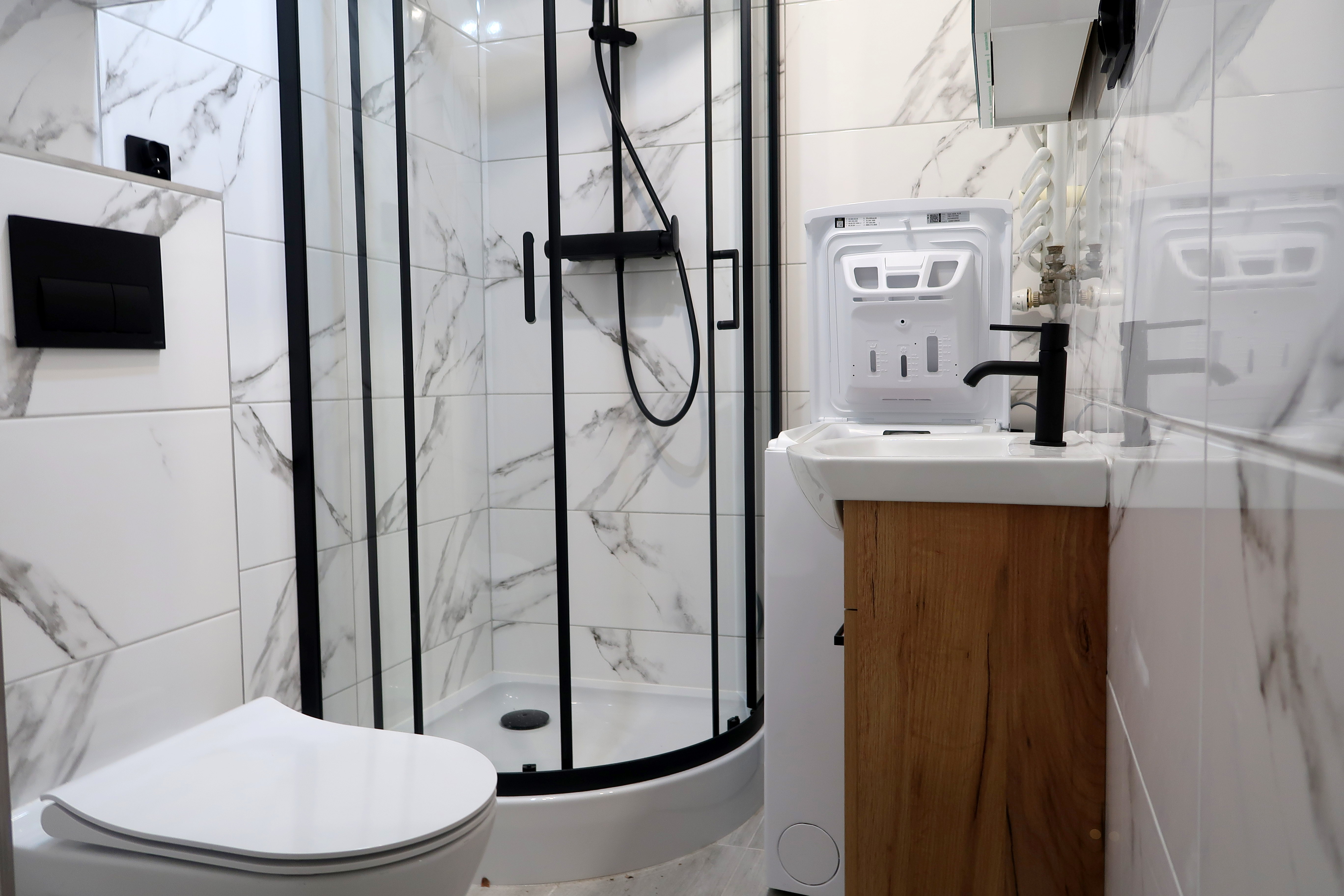 Kuchnia wyposażona w niezbędny sprzęt AGD, łazienka z prysznicem i nową armaturą.